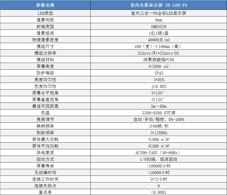 P6室內小間距高清全彩LED顯示屏技術參數: