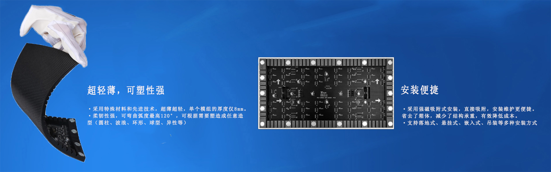 LED無縫拼接軟屏也稱作柔性LED顯示屏,軟模組、柔韌好、任意可彎曲,安裝可以是任意曲面,適合藝術造型;采用特殊材料和先進技術,超薄超輕,單個模組的厚度僅8mm,不僅輕薄,可塑性強,該系列LED軟模組屬于異形LED大屏,采用可彎曲pcb和硅膠底殼套件,柔韌性強,可彎曲弧度最高120°(適用于圓柱屏、波浪屏、環(huán)形屏、球型屏、彩帶屏弧形屏等顯示場合)