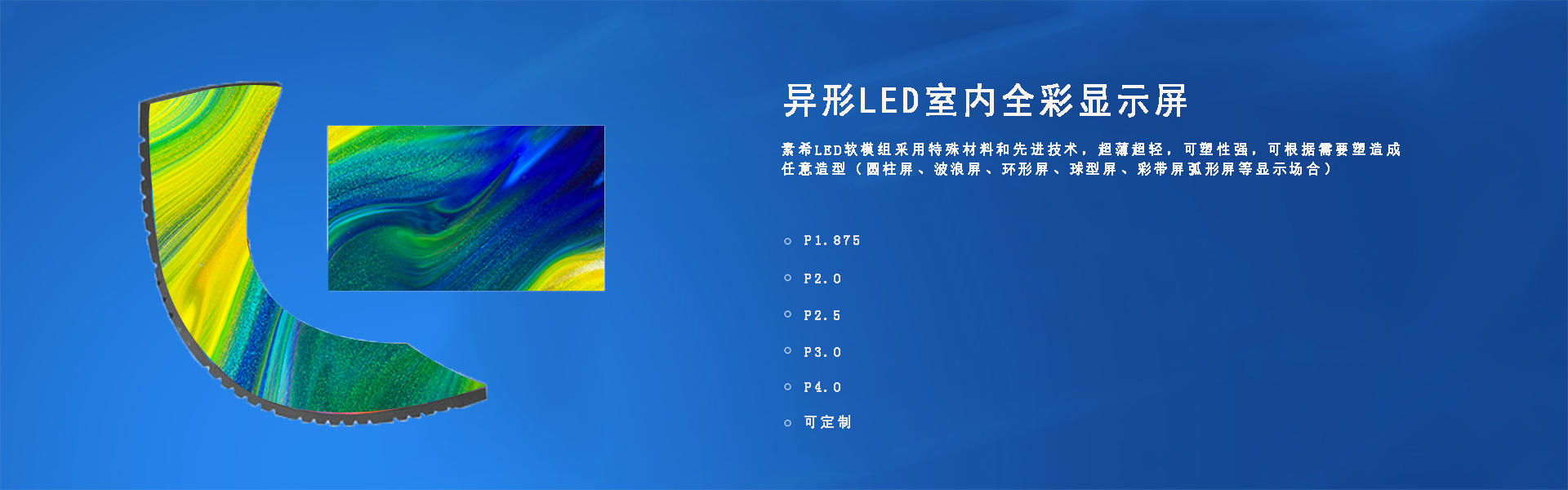 LED無縫拼接軟屏也稱作柔性LED顯示屏,軟模組、柔韌好、任意可彎曲,安裝可以是任意曲面,適合藝術造型;采用特殊材料和先進技術,超薄超輕,單個模組的厚度僅8mm,不僅輕薄,可塑性強,該系列LED軟模組屬于異形LED大屏,采用可彎曲pcb和硅膠底殼套件,柔韌性強,可彎曲弧度最高120°低電流,低熱量,高對比度,高亮高灰,刷新1920Hz,真16bit灰度等級,搭配SMD1515純黑燈,黑屏整屏暮色完全一致,像素吻合1920*1152/3840*2304,2K/4K分辨率,播放高清視頻,達到最完美播放效果。(適用于圓柱屏、波浪屏、環形屏、球型屏、彩帶屏弧形屏等顯示場合)