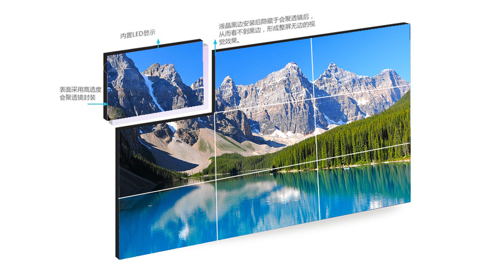 液晶屏正面沒有拼縫,以及沒有黑框線條,兩屏之間共用一整條邊縫補(bǔ)償屏跨接顯示,左邊縫補(bǔ)償屏覆蓋右黑框;上邊縫補(bǔ)償屏覆蓋下黑框。完全覆蓋屏與屏之間的安裝物理間隙;采用小點(diǎn)距邊縫補(bǔ)償顯示技術(shù)與液晶顯示單元的完美結(jié)合,使畫面整體性近似小間距LED產(chǎn)品,畫質(zhì)、分辨率、成本、色彩還原、維護(hù)等方面大大優(yōu)于小間距LED產(chǎn)品。